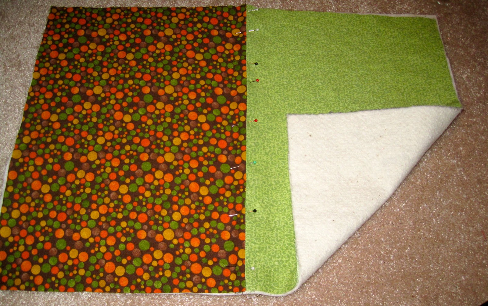 - Pin on the batting. Pin the batting to the wrong side of the outer fabric & lining unit you just created in step one. See picture under Step 2 below.